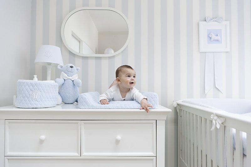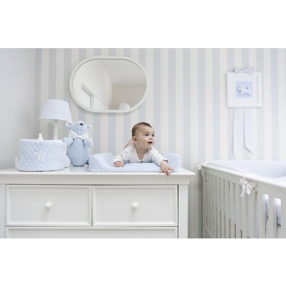 Tapeta biała w pasy w odcieniu zimnego jasnego błękitu, o szerokości 7 cm. Jej kolor został dopasowany do kolekcji Błękitnej, będzie też doskonałym tłem dla dodatków w z beżu oraz szarości. Istnieje możliwość dokupienia listew sztukateryjnych w celu stworzenia niepowtarzalnej dekoracji ściennej.