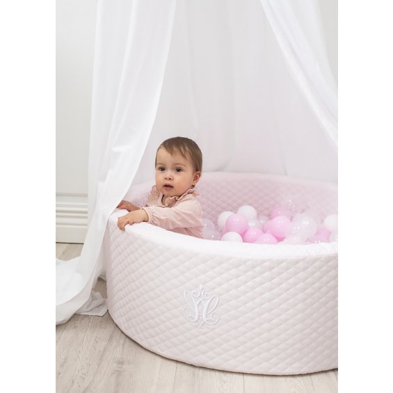 Coraz bardziej popularny produkt - suchy basen z kulkami. Zapewnia doskonałą zabawę wspomagając jednocześnie rozwój sensoryczny i motoryczny dziecka. Na początku może być używany jako kojec, później jako basen z piłeczkami. Beżowy pikowany pokrowiec zapinany jest na suwak, co pozwala łatwo go zdjąć do prania, jak również wyjąć wewnętrzną gąbkę. Obszycie ozdobione jest eleganckim złotym firmowym emblematem.